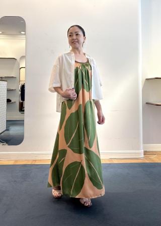 葉っぱ柄が目立つのはグリーン。全体的に明るく、顔色が綺麗に見えました。夏っぽい感じ。対するブルーは落ち着いたカラー。ジャケットとブーティあわせで秋まで使えます。