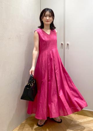 ウエスト位置をやや高めに設定することで、スタイルよく見え、また裾の分量感で1枚着で華やかに見えるシルエット。夏にぴったりなワンピースです。同素材でシャツあり。
