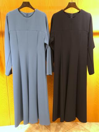 パネル切り替えでウエストから裾まできれいな女性らしいシルエットを意識し、ドルマンスリーブで抜け感を持たせました。素材の持つ軽さとハリ感できれいなシルエットがキープされます。