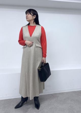 ツイード素材で少し温かみがあるので、艶感のあるブラウスの上から着用するスタイリングがおすすめです。また、フィット感のあるニットと合わせる着こなしもおすすめです。