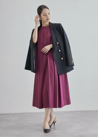 クルーネックのIラインワンピースはエレガンスなボリューム感のある深めのタックプリーツデザイン。Iラインに見えますがプリーツの広がりでボリューム感があるので動きに合わせて揺れるシックエレガンスに仕上げました。1枚でさっと様になるデザインなのでベルトなどでアクセントを加えるのもおススメです。