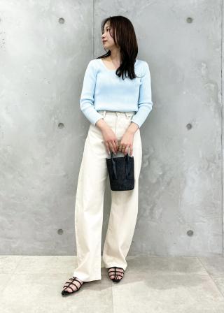また、シンプルに無地のトップスを合わせたり、少しボリュームのあるブラウスは、インでもアウトでも今年らしい装いに。トップスをゆるっとパンツにインすると、ハイウエストのデザインをさらに素敵に活かしてくれます。夏にはサンダル合わせて、お洒落な足元と抜け感を楽しんで。