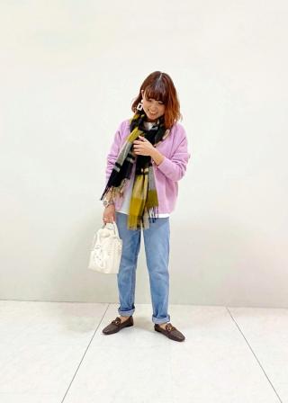 152cmで36サイズを着用しています。ハイウエストのデニムなので腰回りからウエストにかけては程よいフィット感がありますが、ヒップから太腿にかけてはゆとりがあり、膝から足首にかけてはスッとテーパードのシルエットになっています。今回はトップスにボリュームのあるブラウスなのでスッキリ見せるよう、36サイズを選びました。