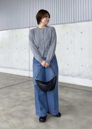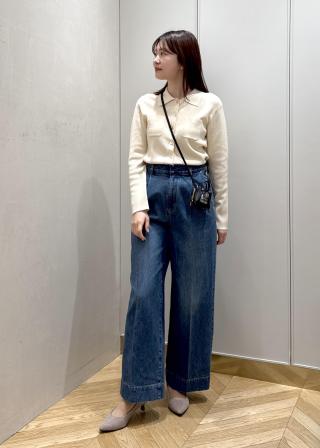 同シリーズのデニムフリルブラウスとのセットアップ風コーデがおすすめ。ニットやツイードジャケットなど、きれいめアイテムとも相性がよく、大人カジュアルから上品スタイルまで幅広く活躍します。