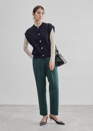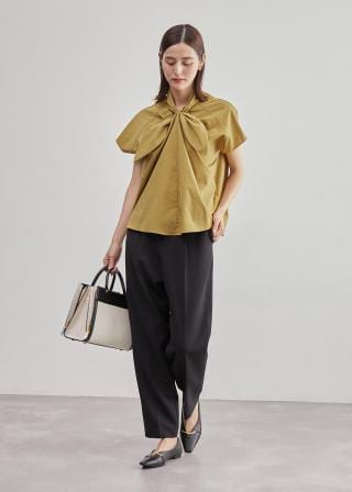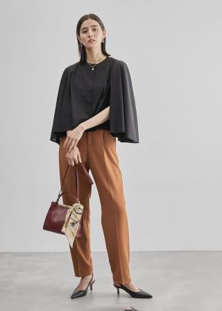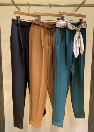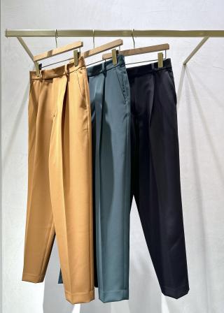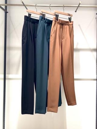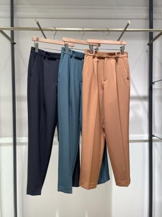 腰回りはタック入りでゆったりと、脚のラインは裾にかけて細くし、スッキリとしたシルエットに仕上げました。後ろゴムギャザーで快適な履き心地です。