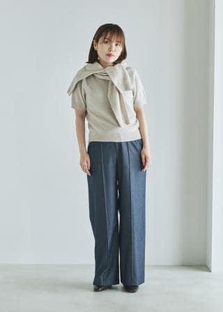 センターシームが特徴のワイドパンツです。ややハイウエスト設定で腰回りがすっきりとしたシルエットに仕上げており、ヒップが高く見えることで美脚効果も叶います。後ろのみゴム仕様なので、着用しやすいのもポイントです。ハイウエストとすっきりシルエットで上品に着こなせる1本です。