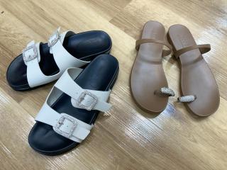 キラキラと華やかなビジューのバックルを使用した、ベルトデザインのフラットサンダルです。カジュアルになりすぎない絶妙なベルトの幅とソール周りのバランスにこだわりました。疲れにくくコンフォートな履き心地で自然に足へフィットするフットベッドを使用し、長時間歩いても疲れにくい履き心地にしています。アウトソールはEVAソールを積み上げているため、足元に程よいボリュームをプラスしてる1足です。