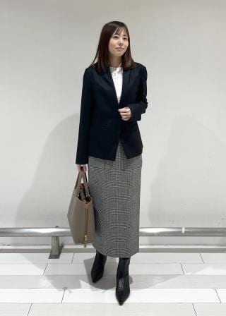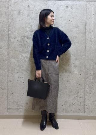 同素材のジャケットとセットアップスタイリングはもちろん、ミニケーブルのアンサンブルや、ハイゲージVカーディガンの釦を止めてインしたスタイリングもおすすめです。