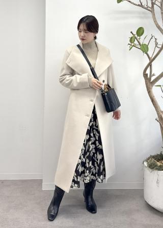 裾に向かってやや広がりのあるマーメイドシルエットです。着丈はふくらはぎにかかるくらいの長さなのでショートブーツとの合わせが素敵です◎