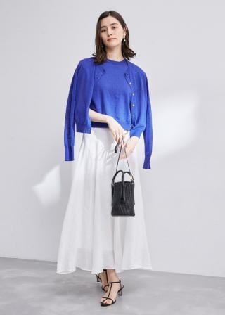 同素材のフレンチスリーブ(品番:GGM23370)とのアンサンブルスタイルがおススメです。ショート丈なのでワンピースとの相性が良く、フレアースカートやタイトスカート、ワイドパンツ等と合わせたコントラストの映えるスタイリングも素敵です。