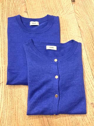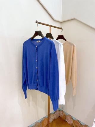 ショート丈のカーディガンはロゴ入りのゴールド釦でエレガントさをプラスしました。釦をすべて留めてプルオーバーのようにも着られます。