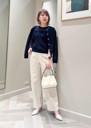 カーディガンを肩に羽織ったアンサンブルでのコーディネイトがおススメです。透かし柄がフェミニンな印象なので、ボトムはすっきりとしたスラックスタイプで合わせると少しマニッシュなスタイリングに。ボリュームスカートとの華やかなフェミニンスタイルも素敵です。フロント釦をすべて留めて1枚着としてのスタイリングも◎カーディガンと合わせてアンサンブルで着られる5分袖ニット(品番:GGM24080)もございます。