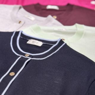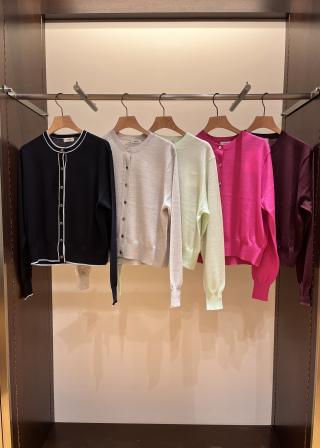 ベーシックなクルーネックカーディガン。ロゴ入りの金ボタンがポイントです。サイズ感はややゆったりで、今季はよりハイウエストボトムやワンピースに合わせ易いようにショート丈にしています。