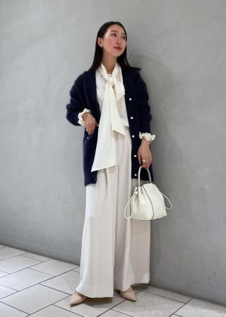 パンツスタイルは勿論、刺繍や張りのあるジャンパースカートやワンピース合わせでクラシカルモダンなスタイルがオススメ。いつものスタイリングにさっと羽織れば、暖かさと華やかさをプラスできます。ヒップが隠れる長めの丈なので、上からベルトをしたウエストマークのスタイリングも◎コートインとしても着やすく1枚あると大活躍するカーディガンです。