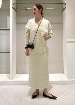 防寒としてだけでなく、スタイリングのクラスアップとしての着こなしにも。同素材のスカート(品番:GGC34120)とのセットアップもおすすめです。カットソーとデニムのスタイルにさっと羽織るようなカジュアルスタイルや、ワンピースとのフェミニンスタイルにもマッチ。とろみやシアーなどの対照的な素材をインナーにしても素敵です。