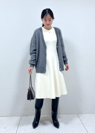 カーディガンのみ繊細なラメの入った糸を引き揃えて、さりげなく上品な煌めきをプラスしています。