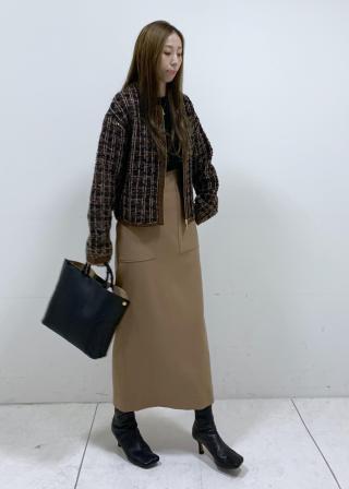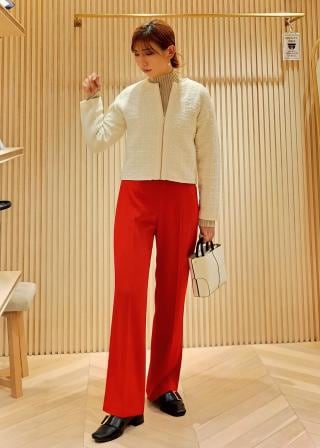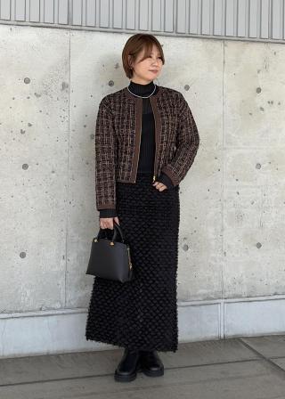 エレガントなツイード調素材にジップアップを組み合わせたデザインです。カーディガンとブルゾンの中間のような絶妙なバランスで、羽織として着まわしやすく、きれいめスタイルにもリラックス感のあるスタイルにもマッチします。