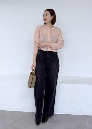 着丈はコンパクトで腰骨にかかるほどです。すっきりと見えるシルエットでハイウエストのボトムやワンピースの羽織としてもおすすめです!