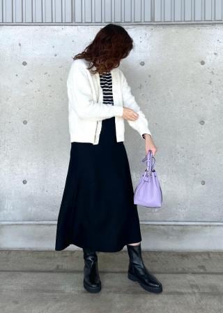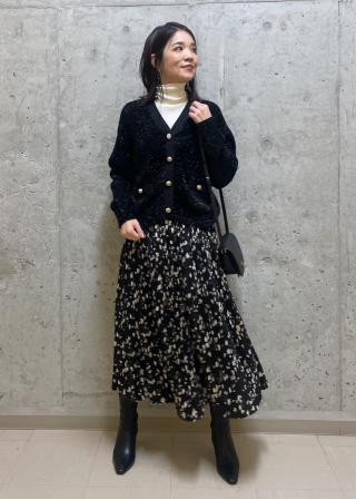 クラシカルモダンスタイルでチュールやプリントのプリーツスカート、ガンクラブスカートにブーツ合わせがオススメです。冬らしい素材感を盛り上げるボトムとの合わせがオススメです。