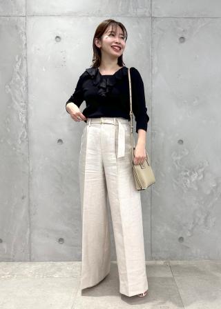 ボディはすっきりと程よくタイト過ぎないシルエットにしています。ネックまわりもすっきりと見えるVネックに、上品なツヤと質感のコットンシルクローンのカスケードフリルで、1枚で華やかな印象に仕上げました。