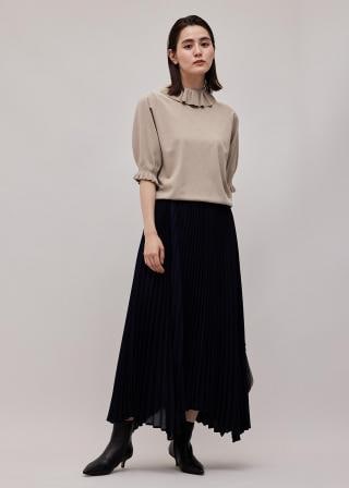 畦フリルがポイントのプルオーバー。見頃と同じ糸でフリルを作れるのはニットならではのテクニック。袖に程よいボリュームを持たせてモードな雰囲気に仕上げた、コーディネートの主役になれるニットです。