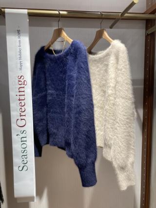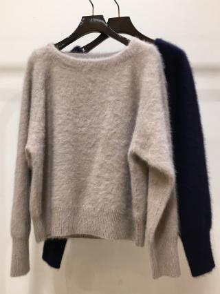 ボートネックのプルオーバーはふわふわの毛足感が特徴的なので肩まわりを少し立体的に仕上げた着映えするミニマルなデザインに仕上げています。ミニマルながら袖にはボリュームを持たせたデザインに。ウエストには絞りをいれた高級ニットだからこそシンプルに豊かさを持たせたアイテムです。