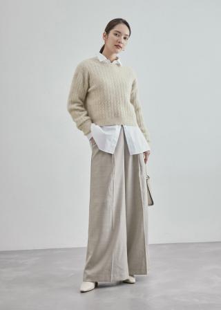 クラシカルエレガンスなムードに仕上げたミニケーブルニットは着丈を短くしたモダンなバランスに仕上げています。クルーネックでクロップド丈に近いバランスに仕上げ、鮮度のあるコンパクトめなシルエットなのでボトムスを変えると様々なシーンで活躍。今シーズンは一枚は持っておきたい一押しのアイテム。