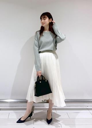 キレイメなコートやダウンコートのインナーとして。春を感じさせる温かいカラーとパールモチーフで存在感があります。フェミニンなトップスなのでスカート合わせがおススメです。