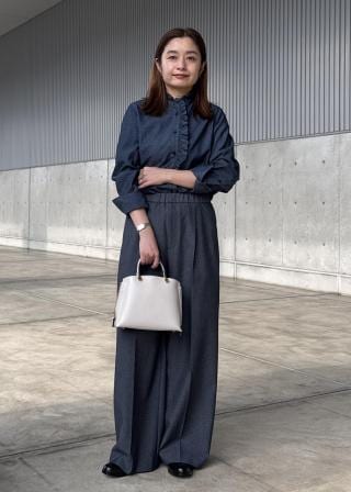 着丈は前が少し短めになっているので、丈長めなスカートやワイドパンツでも合わせやすいです◎