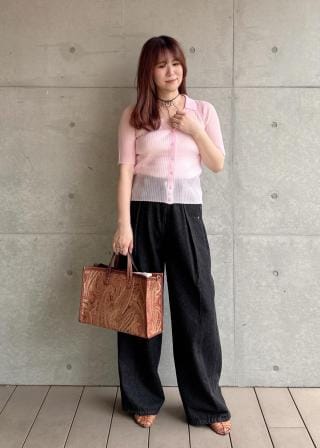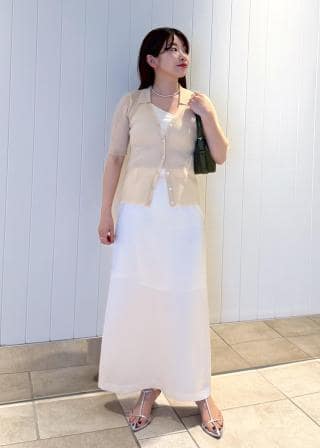 リネンライクのタックパンツやマーメイドスカートなどシンプルなものと合わせてすっきり見せてください。