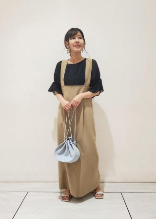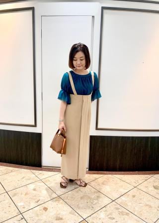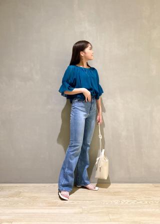 ゆったりめのサイズ感で首元は鎖骨が程よく見える空き具合で女性らしい印象です。
