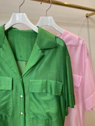 オープンカラーシャツはメンズライクなボクシーなシルエット。裾や袖口の見返しを大きく作ることでフレンチシックなアイテムに。シアーな素材を使うことでセンシャルな羽織りシャツに。立体的なフォルムにも拘った女性らしいハーフスリーブシャツです。
