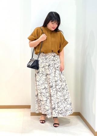 シャツ羽織としても一枚着ブラウスとしてもシーズンを通して使えるアイテム。セットアップのスカートでウエストインしてキレイめカジュアルなスタイルがオススメ。トップスアウトでレザーベルト合わせのスタイルにも。トップスアウトでキレイメなスッキリパンツやナロウな艶のあるスカート合わせもスタイリングの幅として楽しめます。