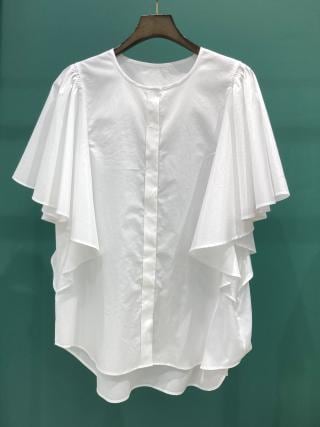 クルーネックの比翼仕立てのブラウスは一枚で華やぐ大人ラッフルスリーブがデザインポイント。オーセンティックな上質なムードとエレガンスなフェミニティーを掛け合わせたエモーショナルなブラウスです。甘くなりすぎないように計算されたディテールなのでクラス感のあるTブラウス感覚で楽しめます。ジャケットのインでも使えるのも嬉しいポイントです。