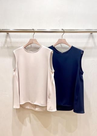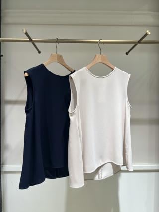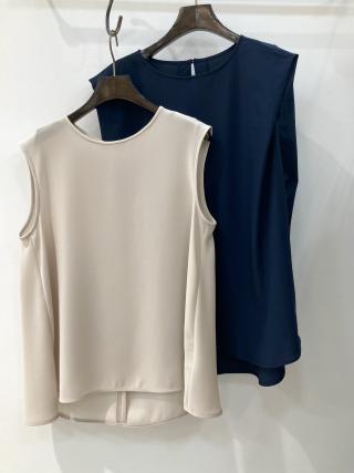 シルエットで魅せるフレアーを入れたAラインノースリーブブラウス。衿まわりはすっきりとつまっていて、着丈に前後差を付けたメリハリをつけたデザインです。