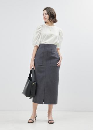 ポケット付きのタイトスカートやデニムパンツなど、すっきりしたボトムとの合わせがお勧めです。