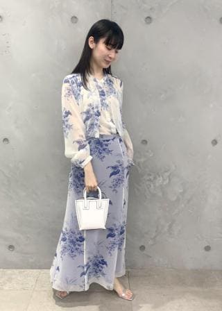 1枚で華やかなデザイン性のあるブラウスなので、シンプルなボトムと相性良くあわせられ、お勧めです。