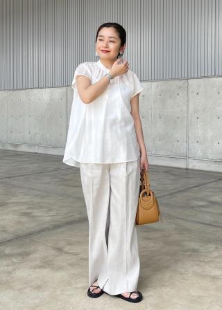 スキッパーデザインのギャザーブラウス。インでもアウトでもきまりやすい丈感で、やや肩にかかる袖丈で二の腕をカバーしてくれるのも嬉しいポイント。ワンポイントに襟の金属ボタンが上品な雰囲気を醸し出しています。