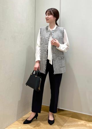 シンプルでスッキリとした印象のボウタイブラウスにパール釦をアクセントにすることで、フェミニンな要素を加えています。