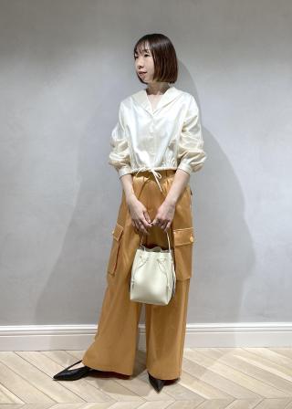 サテン生地のため、カジュアルなのに上品な雰囲気になります。また、低身長な私にも長すぎず丈感が絶妙です。スタイルに合わせて、絞りが自由に調節できるのもGOOD!
