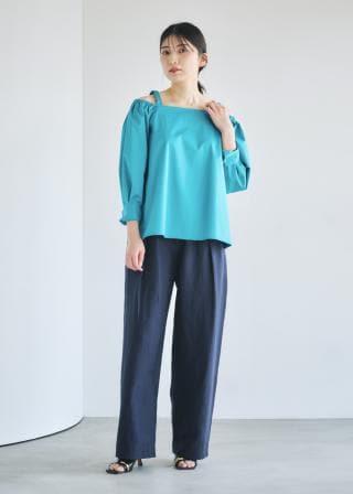 少し幅のある肩紐があることで、露出感が出過ぎずヘルシーに肌見せができるブラウスです。