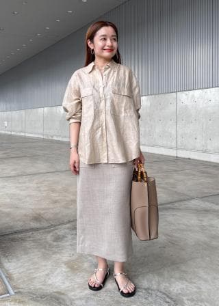 フラップポケットが特徴的なシャツ。ほどよくドロップした肩でゆったりとしたサイズ感。透けすぎないシアー感が上品で、夏のハオリ、1枚着としておすすめです。