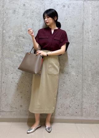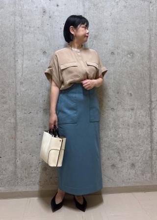 スタンドカラーでドルマンスリーブのブラウス。大きめなフラップポケットが特徴的できれいめに着用でき、お仕事にも着用しやすい素材感。出しても、インしても決まるデザインですが、脇にスリットがあり前のみタックインも可能。