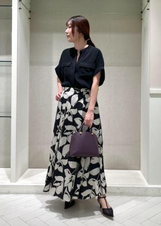 トリアセテートにキュプラを混紡したバックサテンジョーゼット。軽さのある素材感で、夏でも着用できる清涼感。またシワにもなりにくく、イージーに扱える素材感です。