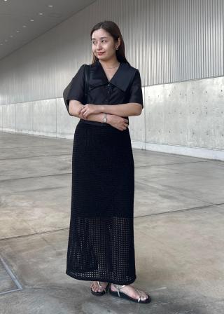 大きめの襟が華やかな印象のブラウス。前開きなので羽織りとしても活用していただけます。