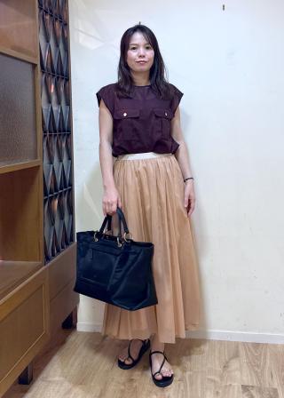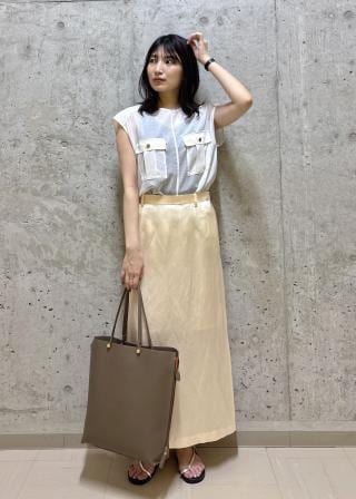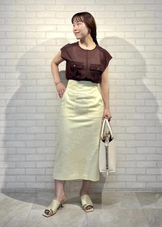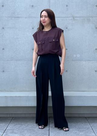 シアーな素材にサファリポケットを胸元につけ、クルーネックにしました。シンプルなノースリーブブラウスに、ROPE’のロゴが刻印されたGOLDの釦がポイントです。