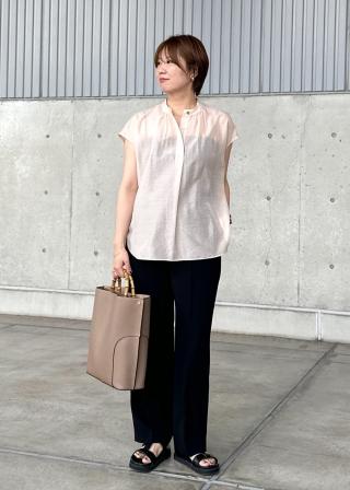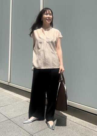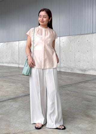 スキッパーデザインのギャザーブラウス。インでもアウトでもきまりやすい丈感で、やや肩にかかる袖もうれしいポイント。ONでもOFFでも合わせやすいアイテムです。