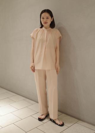 スキッパーデザインのギャザーブラウス。インでもアウトでもきまりやすい丈感で、やや肩にかかる袖もうれしいポイント。ONでもOFFでも合わせやすいアイテムです。
