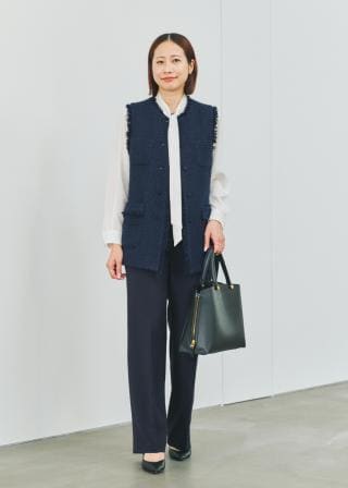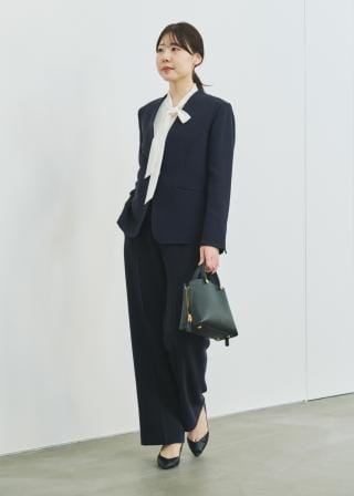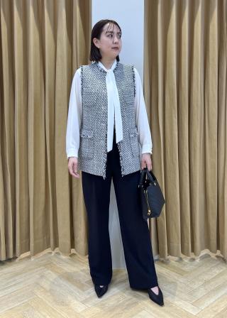 シンプルでスッキリとした印象のボウタイブラウスに、パール釦をアクセントとして加え、フェミニンな要素をプラスしています。