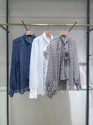 薄手のポリエステル 100%ジョーゼットにロペオリジナルのチェーンプリントを施した特別感のある素材です。生地に織りでドットドビー柄が入っているので、シアーでもニュアンスのある表情が出ています。